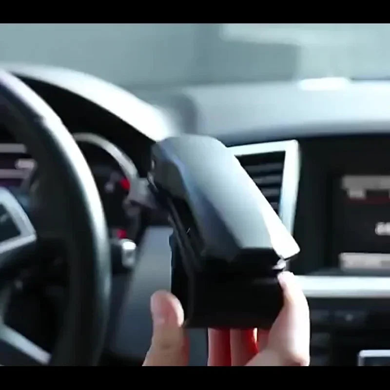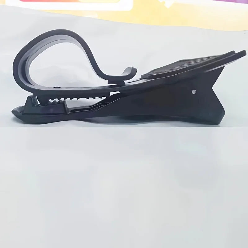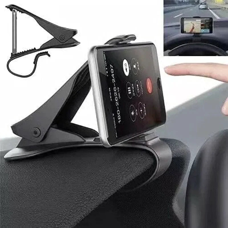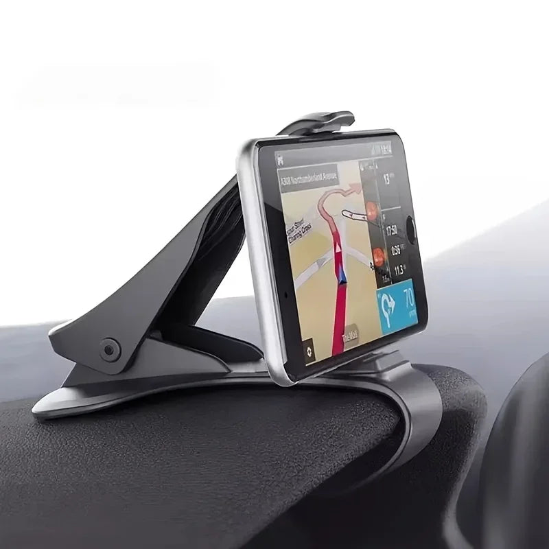 The phone clamp holds the smartphone right above the dashboard and won’t obscure the road view for safe driving.