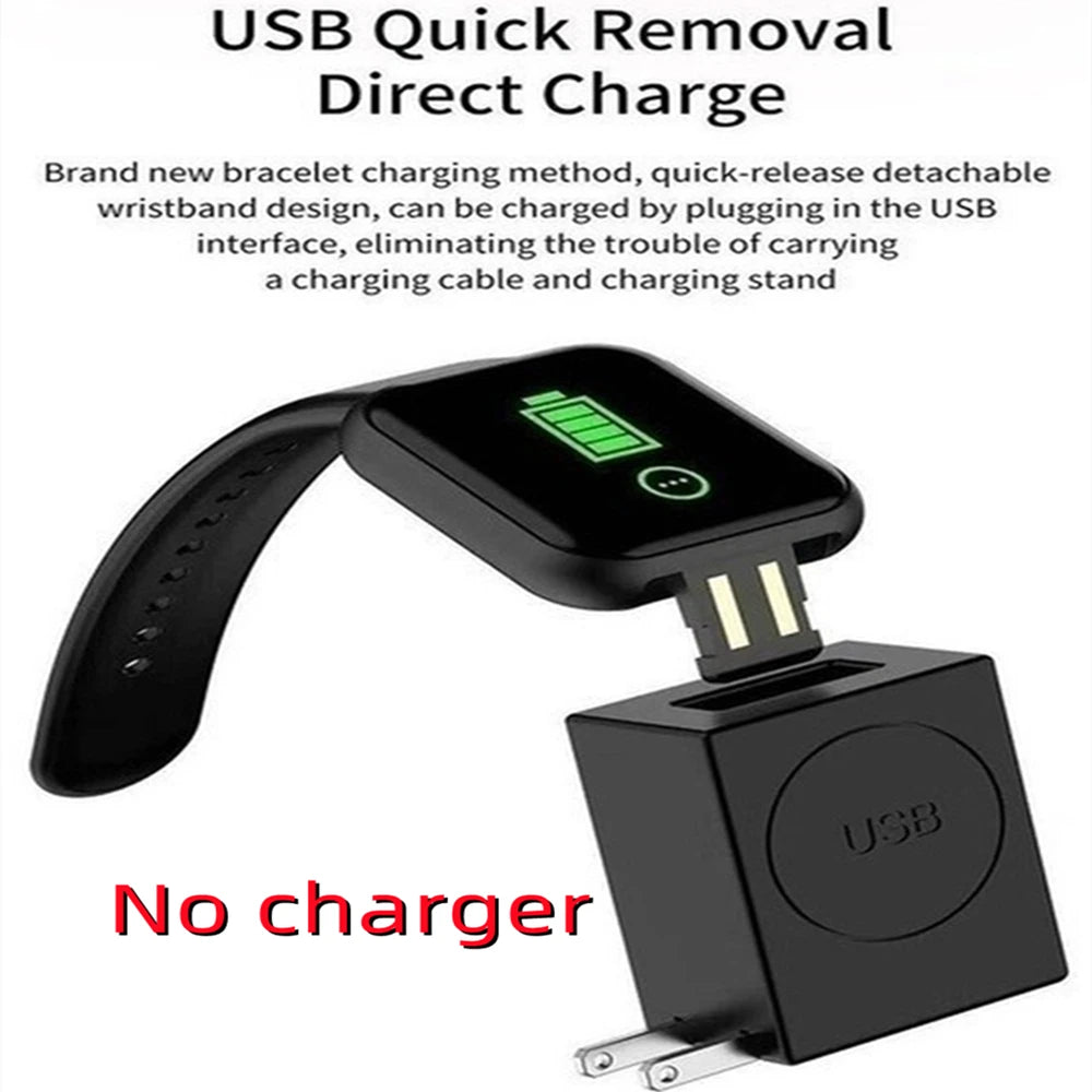 Package Contents: 1 x Smart Watch, 1 x Box,1 x Manual (Note:No Charger. Dear buyers, this watch does not require a charging cable, it can be charged directly through the charging head or USB interface.Dear,The box may be damaged after long transportation, but the watch is fine, please understand.)
