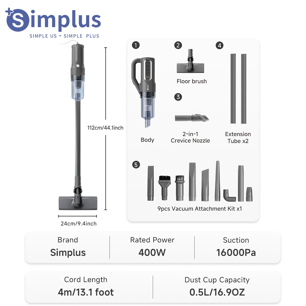 Simplus Vacuum Cleaner 14000PA Household Small High Suction Powerful Cleaning Wired Vacuum, 400W High Power Cleaning Powerful, Cyclone Suction Unparalleled, Large Capacity Dust Cup, Easy to Disassemble and Clean, 4m Super Lon